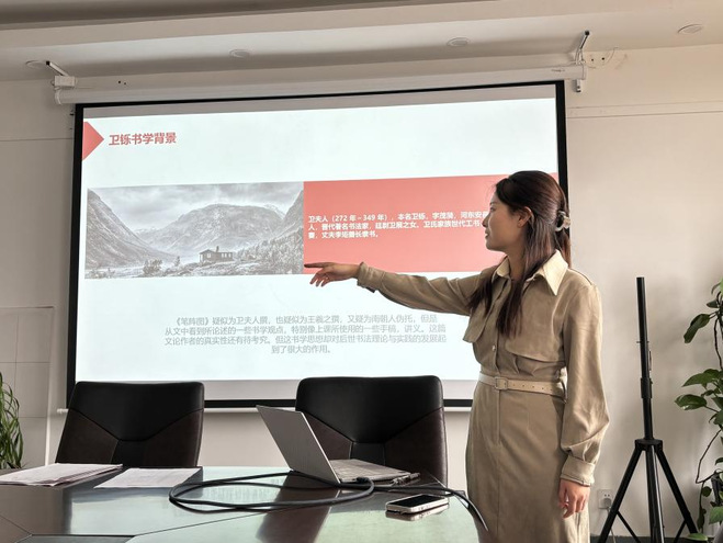 10月12日下午,304永利研究生“博学”学术讲座第12期在学院403会议室成功举办。此次博学讲座由2022级艺术专业曹瑞主讲,分享的内容为“书法美学中‘筋’‘骨’‘肉’之阐释—以《笔阵图》为例》”,点评教师乔基庆及相关同学参加了此次讲座。