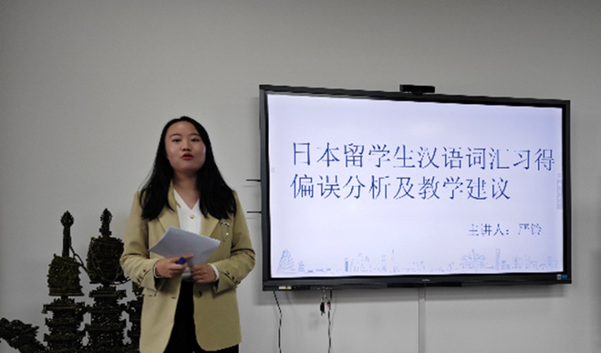 严铃同学介绍了日本职工汉语词汇的习得现状,分析了日本职工汉语词汇习得时所出现的偏误以及偏误产生的原因,总结了对日汉语词汇教学的重点与难点。随后,她列举了汉日同形近义词、汉日同形异义词、汉日异形同义词并做了对比分析,提出了具有针对性的汉语词汇教学建议。