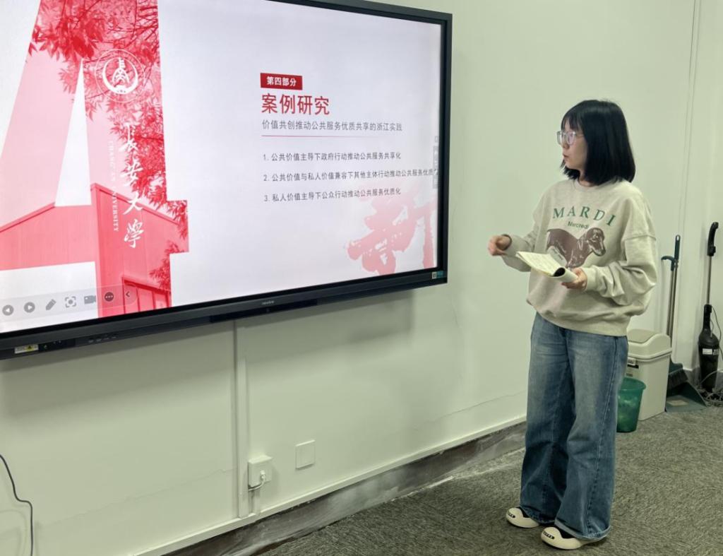 向佳和潘乐深入解读了《价值共创:共同富裕背景下公共服务优质共享的实现逻辑》一文。文章基于价值共创理论,构建了“共同富裕价值导向-多元主体价值共创-公共服务优质共享结果”的分析框架,探讨了政府、企业、社会组织和公众在公共服务优质共享中的角色与行动。通过浙江省的典型案例,文章揭示了多元主体如何在不同层次上推动公共服务的优质化和共享化。分享会中,同学们积极讨论,认为该研究为共同富裕背景下的公共服务改革提供了重要理论支持和实践启示。