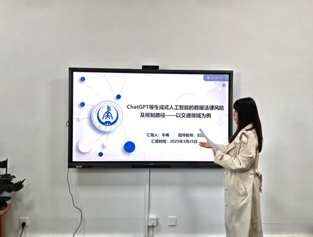 分享结束后,指导教师刘志肯定了此次讲座的选题并对主讲内容进行了分析点评。她指出,聚焦生成式人工智能在交通数据领域的风险进行研究具备现实性与必要性,应进一步加强科技与法律的交叉分析。同时,人身安全保护令制度是《反家庭暴力法》的核心,要使这一制度在我国更好地发挥作用,还需要结合我国的具体情况,在实践中不断探索和改进,提高其实际应用效果。最后,在场同学就分享内容发表了自己的观点,并对相关理论与实践问题进行了探讨。