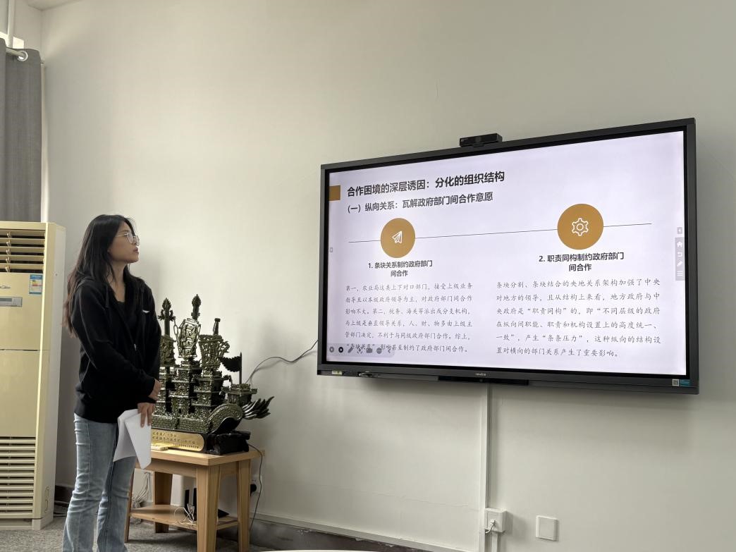 郭鑫结合于丽春副教授所著《并联审批促进政府部门间合作研究—基于目标和行动的维度》一书展开讲解。她首先对我国并联审批的发展历程进行了系统梳理,从萌芽阶段到发展阶段再到成熟阶段,详细分析了并联审批在不同阶段的特点与创新实践。她指出,本书所探讨的并联审批作为一种创新的审批方式,通过整合行政部门、精简办事流程,有效提升了审批效率,打破了传统“串联式”审批模式的弊端,为解决政府部门间合作困境提供了新的思路。