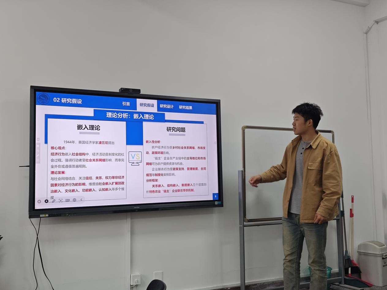 郑攀首先从现实困境与政策支持两个维度阐述了文章的研究背景。随后,他详细介绍了嵌入理论的核心内容,并深入分析了该理论在其研究中的适配性,进而以此为基础,清晰阐释了理论框架的构建过程。接着,他简要说明研究采用的内生转换模型,呈现了相关实证分析结果,并针对性地提出了一系列提升联农带农效应的政策建议。