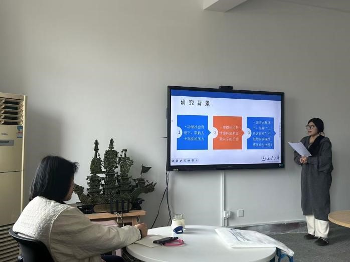 王佳慧首先讲述了功绩社会背景下职场群体的压力与情感需求。接着,她介绍了虚拟社区的情感支持作用,以及访谈对象与数据收集情况。然后,她介绍了小组成员以留言、发帖为主的互动特点。随后,她从时间量、亲密程度、情感强度、互惠服务四个维度重点介绍了弱关系视角下的情感互动机制。最后,她总结到成员长期互动推动弱关系向强连接转化,小组形成互助共享的良性机制。