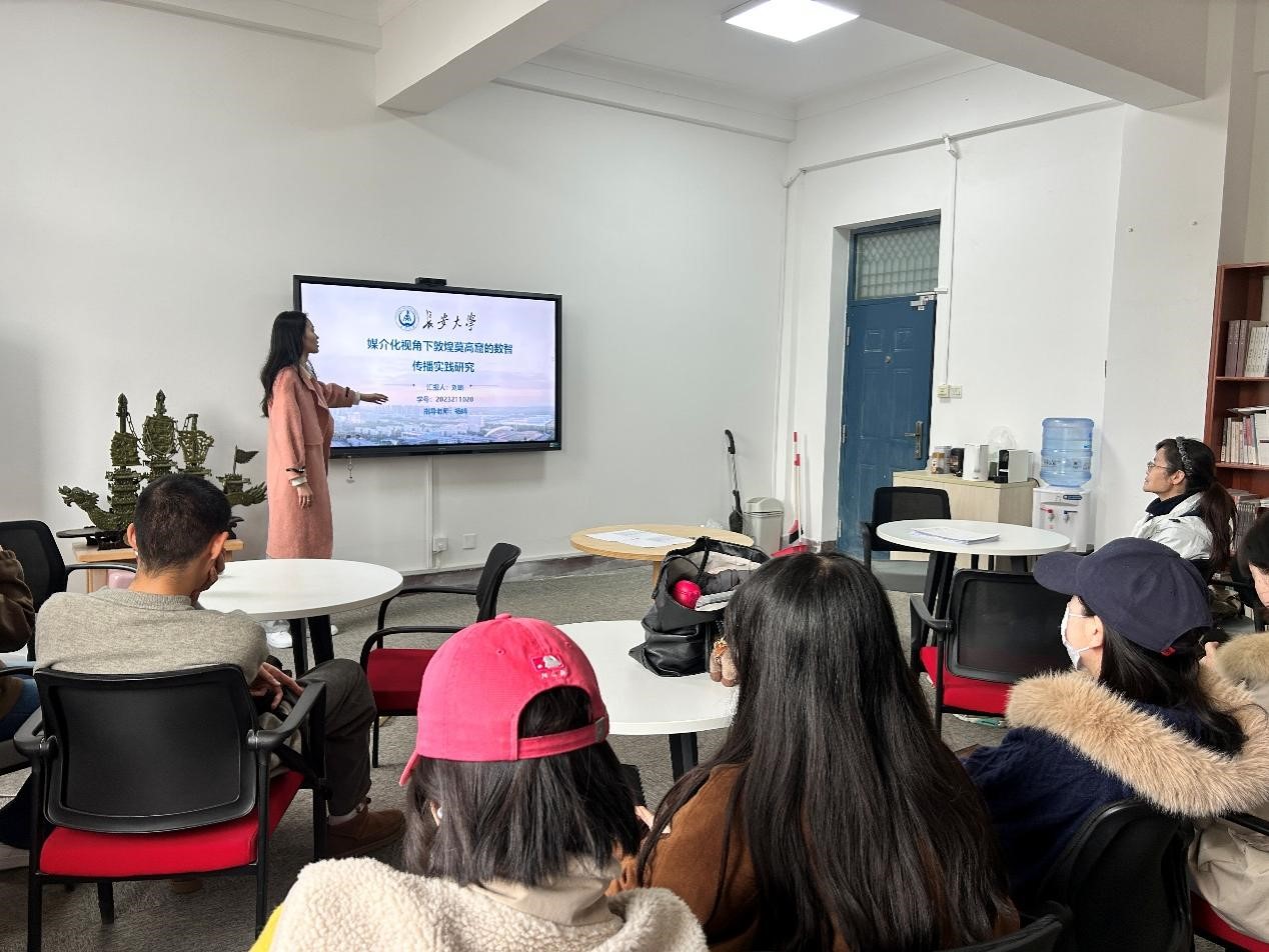 分享结束后,在场同学围绕文章内容展开了讨论。指导教师杨靖对分享内容进行点评,她肯定了研究选题的创新性,并对如何规范撰写硕士论文提出了建议。