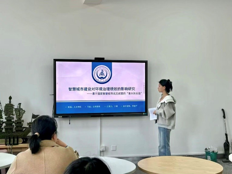 王洒首先介绍了选题的背景与意义,指出当前我国环境治理仍面临治理手段精准化不足、跨主体协同机制不健全、产业结构转型压力突出等问题。接着,她对智慧城市和环境治理绩效的相关概念和理论基础进行了说明。随后她介绍了环境治理绩效的指标体系、测度方法和测算结果。最后,王洒提出智慧城市建设对环境治理绩效具有显著且稳健的正向促进作用,并从优化顶层设计与区域联动、深化技术赋能与多元共治、引导绿色新兴产业发展和实施差异化精准施策等方面提出了相关建议。