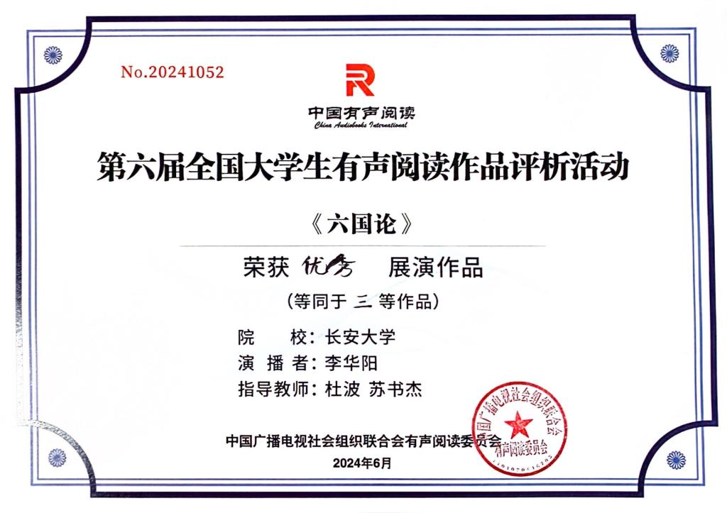 近日,第六届全国老员工有声阅读作品展演活动在四川成都落下帷幕,304永利2023级新闻与传播专业研究生李华阳参赛作品《六国论》受邀参与线下展演,并荣获三等奖。304永利荣获优秀组织单位。