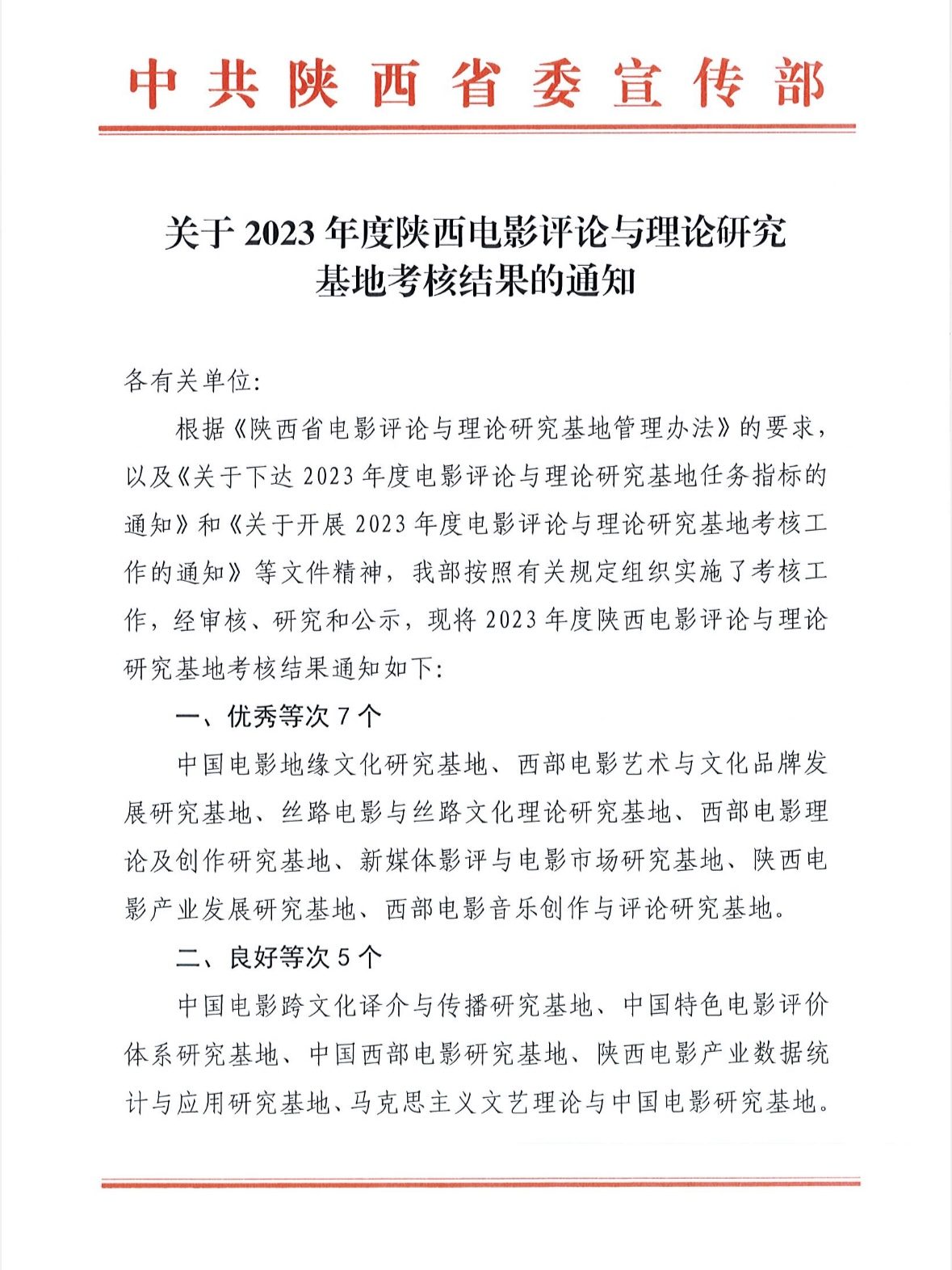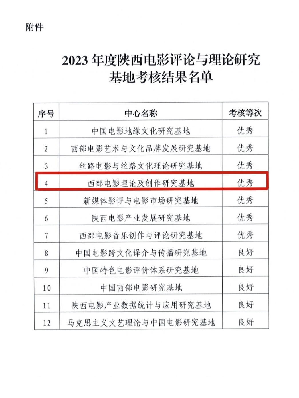 近日,中共陕西省委宣传部公布了2023年度陕西电影评论与理论研究基地考核结果,全省共有12家单位参加此次考核。304永利“西部电影理论及创作研究基地”在这一过程中表现突出,认真整理并递交了2023年度的各项研究成果。通过基地材料审核和公开答辩等多个环节,最终在考核中荣获“优秀”等级。