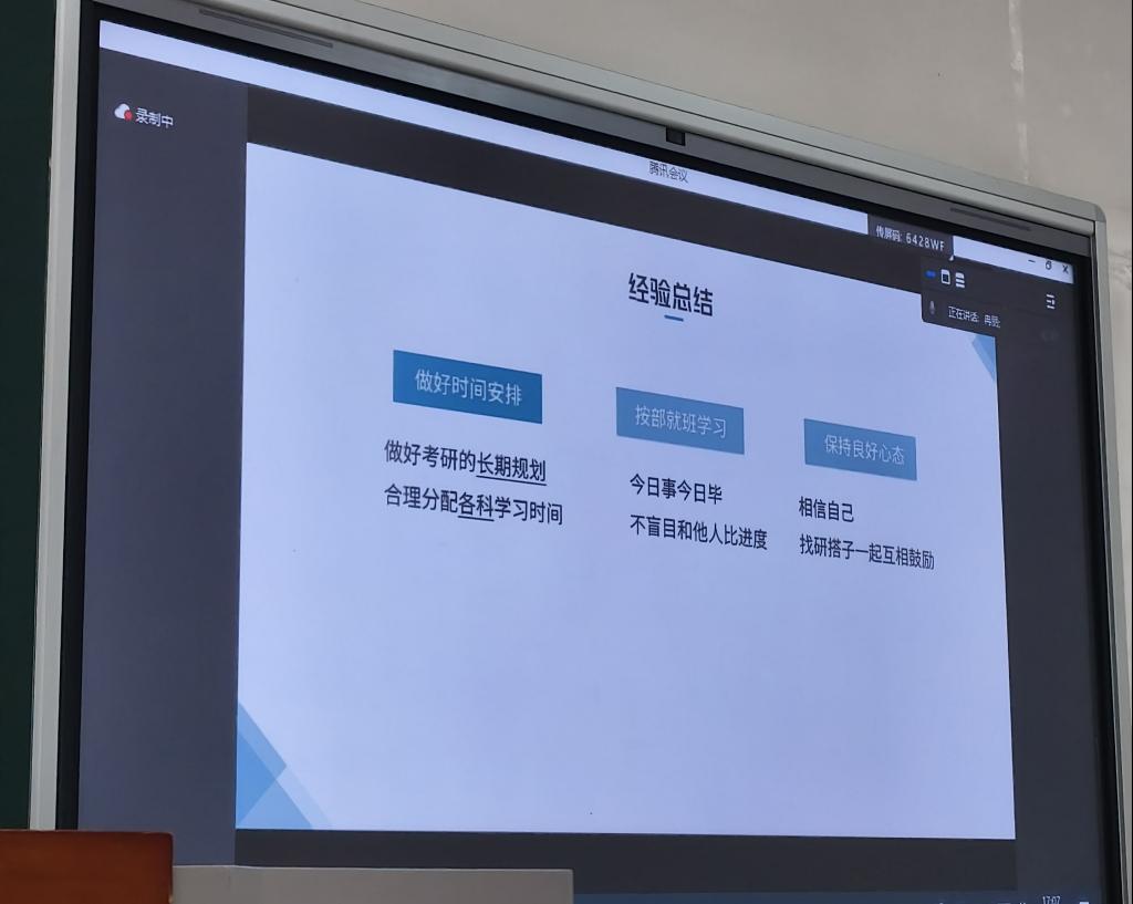 会上,2024届毕业生代表分享了考研经验,行政管理专业的冉丽和公共事业管理专业的俞冉冉围绕升学目标,就考研择校、基础课和专业课备考等方面对学弟学妹们进行了细致的指导。2021级行政管理专业员工冯洵就实习和就业经验进行了分享,为同学们提供了宝贵的职场洞察。各位老师详细解答了同学们提出的问题,分享了自己在升学就业方面的经验和教训,并对同学们提出殷切期望,指出大三暑期对于落实毕业去向,实现升学和就业是个关键的时间节点,应把握好暑期黄金时段,积极准备,在未来的学习和职业发展中再创佳绩。