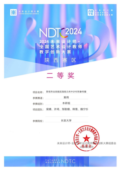 近日,2024未来设计师·全国艺术设计教师教学创新大赛(NDTC2024)评审工作落下帷幕。304永利广播影视系师生团队侯婧、许琦、邹韵婕、韩雪、魏宁杉提交的教学案例——《影视专业技能实践助力关中乡村形象传播》,获得陕西赛区案例组二等奖。本次获奖是广播影视系教学团队自2021年获得省级一等奖以来,在该系列赛事再度获得的省级奖项。