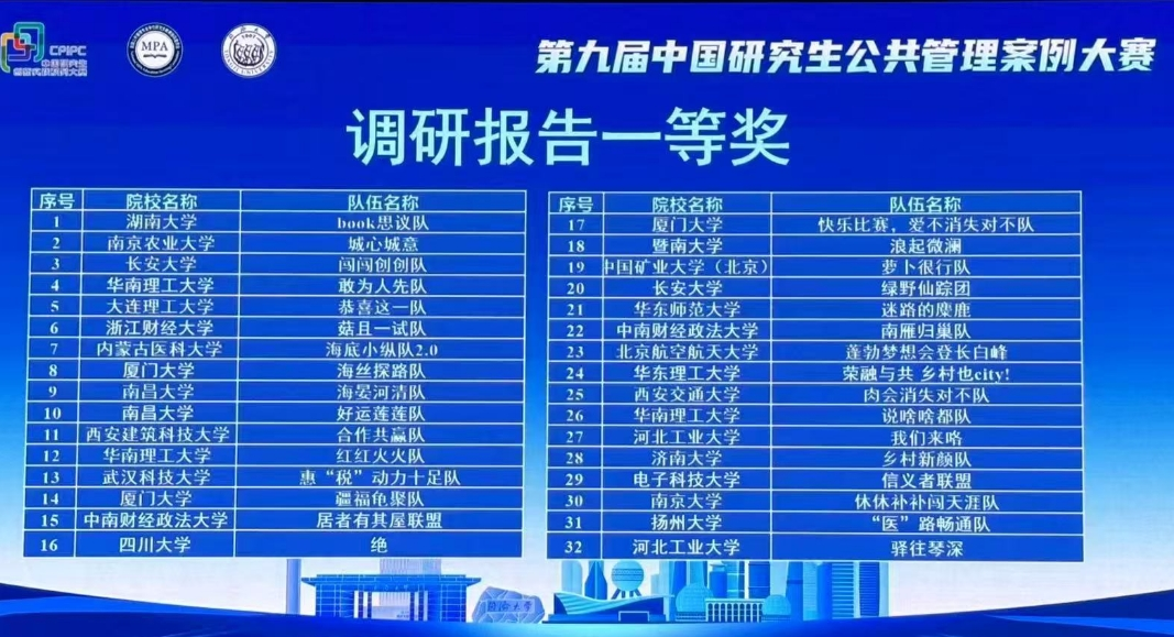 第九届中国研究生公共管理案例大赛于4月20日落幕。304永利共有12支队伍参加比赛,7支队伍通过初赛(前20%),6支队伍获得优秀奖,最终2支队伍进入决赛,荣获调研报告全国一等奖,分别是闯闯创创队(参赛员工:尚薇、张静怡、孙卿、茹政翔;指导教师:包涵川、杨芮)和绿野仙踪团(参赛员工:于博娴、田宇菲、冯聪雅、滕焕、屈珩媛;指导教师:常莉、陈彧)。