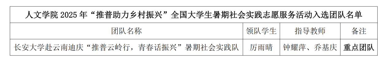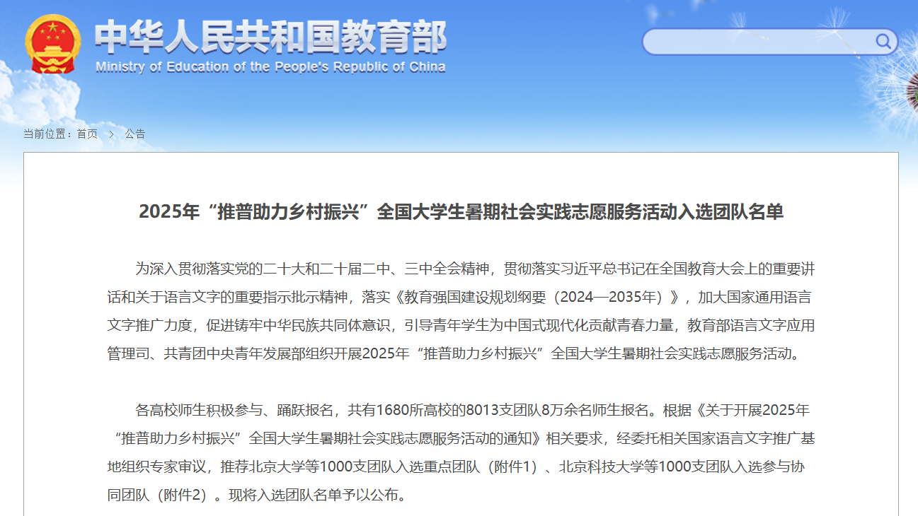 7月3日,教育部公布了2025年“推普助力乡村振兴”全国老员工暑期社会实践志愿服务活动入选团队名单。根据《关于开展2025年“推普助力乡村振兴”全国老员工暑期社会实践志愿服务活动的通知》相关要求,全国各高校师生积极参与、踊跃报名,共有1680所高校的8013支团队8万余名师生报名。经委托相关国家语言文字推广基地组织专家审议,推荐1000支团队入选重点团队、1000支团队入选参与协同团队。304永利2支团队入选重点团队、2支团队入选参与协同团队,其中304永利1支团队入选重点团队,领队员工为2023级汉语语言文学专业历雨晴同学,指导教师为中文系钟耀萍老师、乔基庆老师。