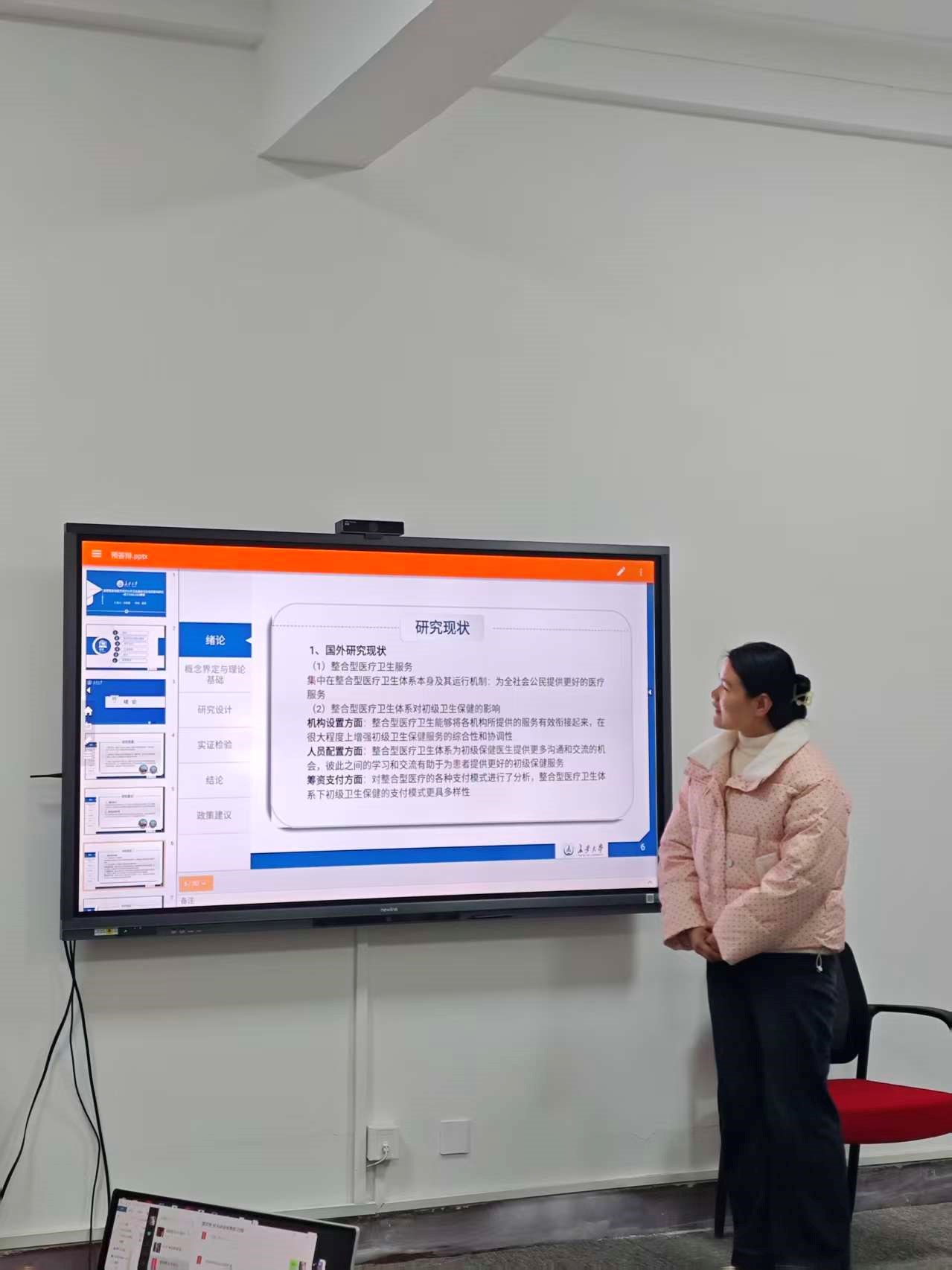 刘倩倩首先讲述了研究的背景和意义,她提出紧密型县域医共体建设是深化基层医疗卫生体制改革、提升县域公共卫生服务可及性的核心举措。接着,她介绍了为精准识别该试点政策的净效应并验证其作用机制。最后,刘倩倩根据研究假设,提出紧密型县域医共体可以显著提升公共卫生服务可及性并给出了针对性的政策建议。