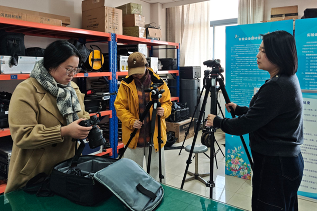 工欲善其事,必先利其器。行前,同学们以小组为单位登记借出摄像机、三脚架等摄制设备,在实验室老师们的指导下检查设备状态,确保后续拍摄的顺利开展。