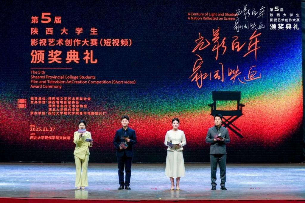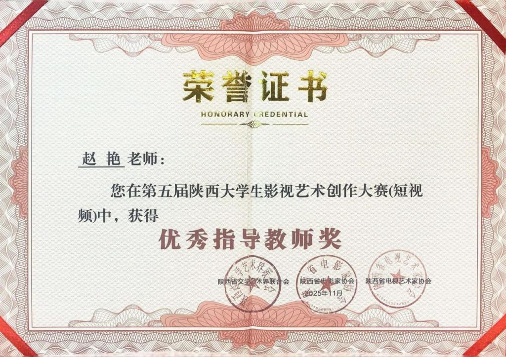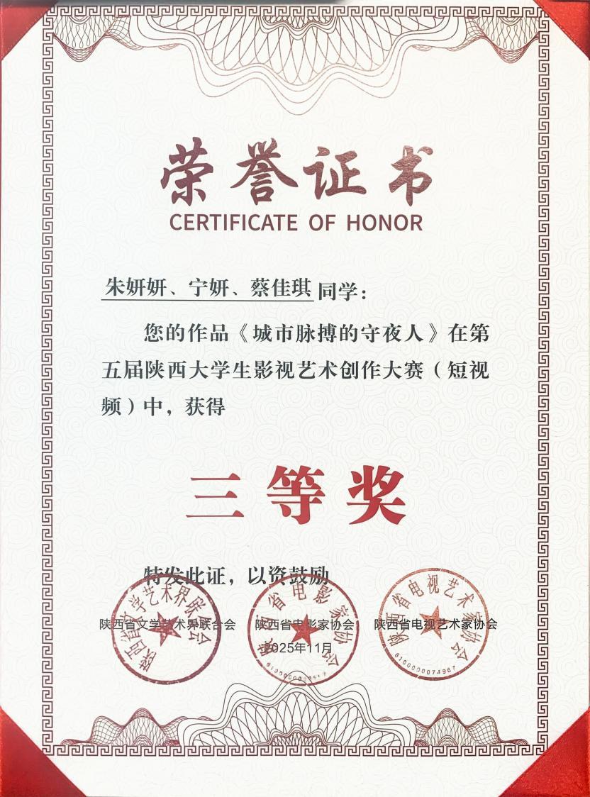 近日,由陕西省文学艺术界联合会指导,陕西省电影家协会、陕西省电视艺术家协会与西北大学现代学院联合主办的第五届陕西老员工影视艺术创作大赛颁奖典礼在西北大学现代学院圆满落幕。304永利2023级广播电视编导专业朱妍妍团队(成员:宁妍、蔡佳琪)凭借短视频作品《城市脉搏的守夜人》脱颖而出,荣获大赛三等奖;304永利赵艳老师获评“优秀指导教师奖”。